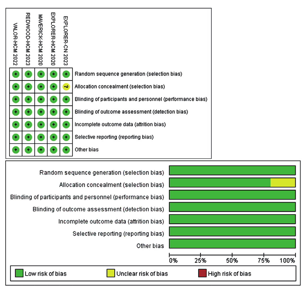 Systematic searches were conducted in PubMed, EmBase, the Cochrane Library, Web of Science, China National Knowledge Infrastructure (CNKI), Wanfang Data, VIP Database, and the China Biology Medicine disc, up to November 9, 2023, for randomized controlled trials (RCTs) of cardiac myosin inhibitors, including Mavacamten and Aficamten in HCM. Review Manager 5.4.1 software was utilized to conduct the statistical analysis.