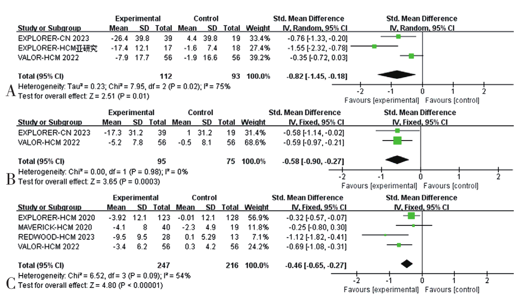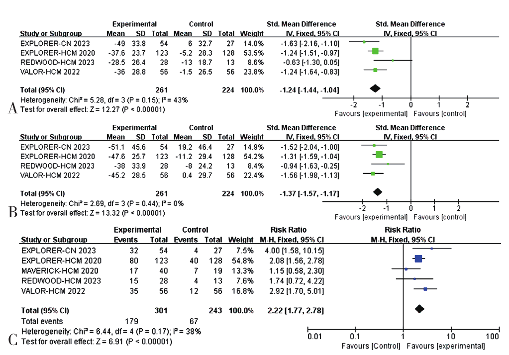 A total of 6 RCTs were included[5 related to Mavacamten (4 original studies and 1 sub-study) and 1 related to Aficamten], involving 544 patients. The meta-analysis showed that, compared to placebo, the cardiac myosin inhibitors group exhibited significant reductions in peak gradient pressure under resting conditions in the left ventricular outflow tract (LVOT) (SMD=-1.24, 95%CI=-1.44 to -1.04, P<0.000 01), and under Valsalva maneuver (SMD=-1.37, 95%CI=-1.57 to -1.17, P<0.000 01), alongside at least a≥1 level improvement in the NYHA functional classification (NYHA-FC) (RR=2.22, 95%CI=1.77 to 2.78, P<0.000 01). Secondary endpoints showed reductions in the myocardial markers NT-proBNP (SMD=-1.28, 95%CI=-2.25 to -0.30), P=0.01] and cardiac troponin (SMD=-0.68, 95%CI=-1.32 to -0.04, P=0.04), improvement in the Kansas City Cardiomyopathy Questionnaire (KCCQ) clinical score (SMD=0.42, 95%CI=0.07 to 0.78, P=0.02), an increase in the rate of patients reaching the composite endpoint events (RR=1.92, 95%CI=1.28 to 2.88, P=0.002), and a reduction in the number of patients needing or eligible for septal reduction therapy (SRT)(RR=0.29, 95%CI=0.22 to 0.39, P<0.000 01). Echocardiographic parameters indicated that cardiac myosin inhibitors could improve the left ventricular mass index (LVMI)(SMD=-0.82, 95%CI =-1.45 to -0.18, P=0.01), decrease the left atrial volume index (LAVI)(SMD=-0.58, 95%CI=-0.90 to -0.27, P=0.000 3), but could also lead to a reduction in the left ventricular ejection fraction (LVEF)(SMD=-0.46, 95%CI =-0.65 to -0.27, P<0.000 01). In terms of safety, the incidence of at least one adverse event in the cardiac myosin inhibitor group was higher than in the placebo group (RR=1.12, 95%CI=1.02 to 1.22, P=0.02), but there was no statistically significant difference in other safety outcomes, including serious adverse events (RR=1.14, 95%CI=0.62 to 2.07, P=0.67), atrial fibrillation (RR=1.27, 95%CI=0.45 to 3.58, P=0.65), nausea (RR=1.77, 95%CI=0.52 to 6.04, P=0.36), dizziness (RR=1.88, 95%CI=0.75 to 4.71, P=0.18), and fatigue (RR=1.35, 95%CI=0.51 to 3.63, P=0.55) compared to the placebo group.