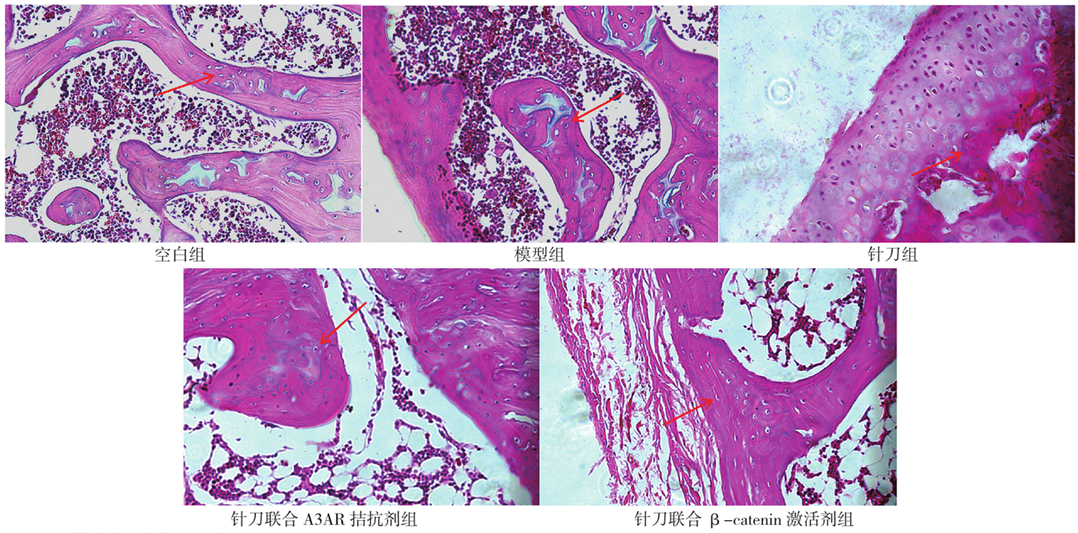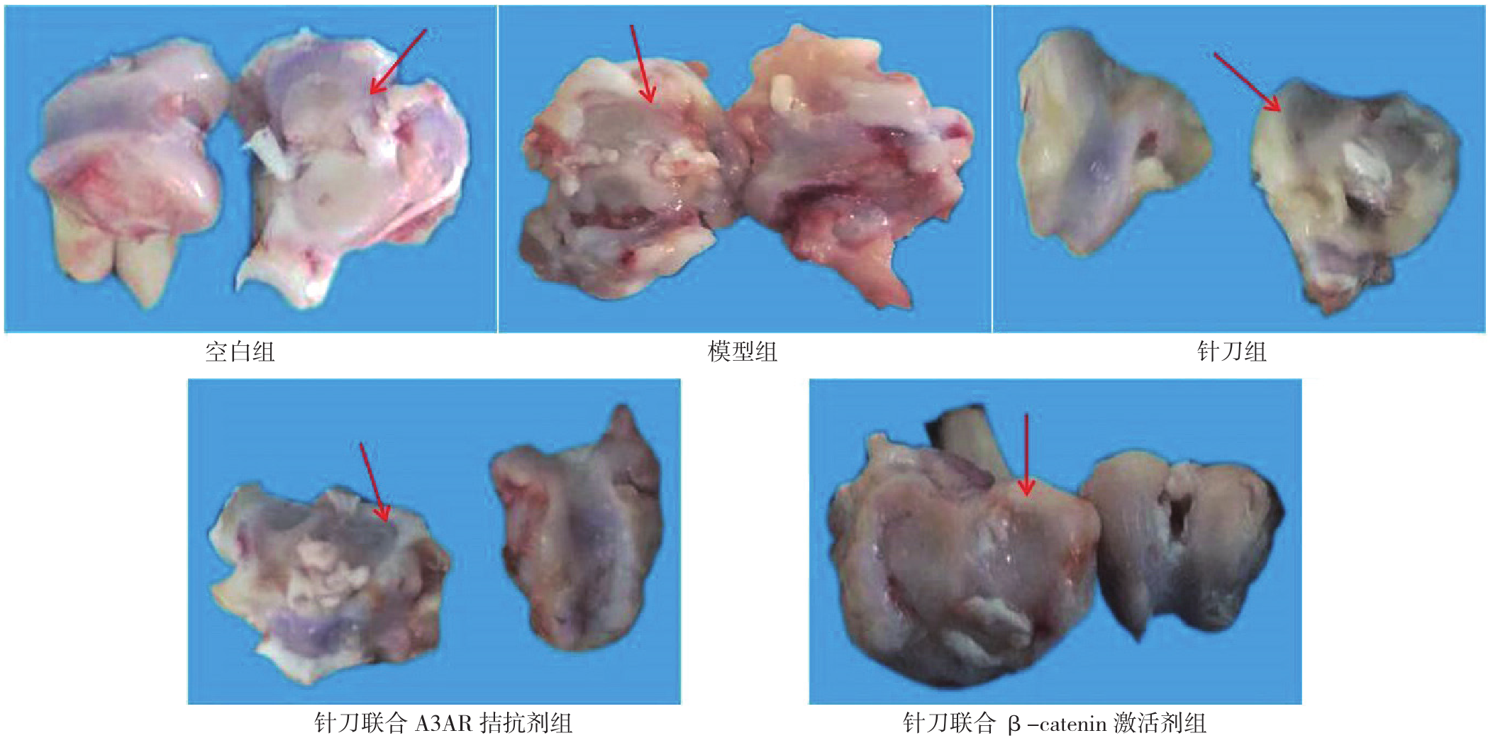 图1 5组大兔干预后膝关节X线结果注:箭头指示为大兔右膝关节间隙;A为大兔右膝关节X线正位片,B为大兔右膝关节X线侧位片;A3AR=腺苷A3受体,β-catenin=β-连环蛋白。