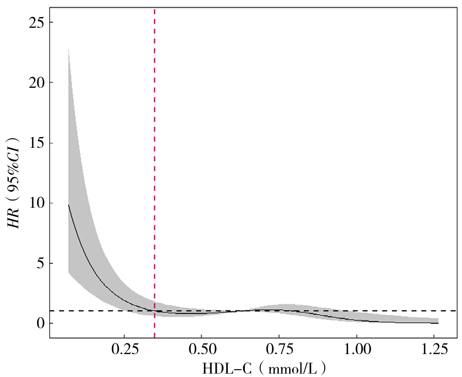 Compared to the BC-PVTT group, the NBNC-PVTT group exhibited higher levels of age, total bilirubin (TBIL), direct bilirubin (DBIL), total cholesterol (TC), and low-density lipoprotein cholesterol (LDL-C), while the proportion of males and the HDL-C levels were lower (P<0.05). Multivariate Logistic regression analysis revealed that serum HDL-C level was an independent factor influencing PVTT in NBNC-HCC patients (OR=0.170, 95%CI=0.054-0.533, P=0.002). ROC curve analysis showed that the area under the curve (AUC) for HDL-C in predicting PVTT in NBNC-HCC patients was 0.702 (95%CI=0.587-0.817), with sensitivity and specificity values of 84.6% and 51.6%, respectively, and an optimal cut-off value of 0.675 mmol/L. NBNC-HCC patients were divided into a low HDL-C group (≤0.675 mmol/L, n=67) and a high HDL-C group (>0.675 mmol/L, n=52). Survival curve analysis indicated that patients in the high HDL-C group had better survival outcomes than those in the low HDL-C group (χ2=27.566, P<0.000 1). After adjusting for age and sex, a nonlinear association between HDL-C levels and the risk of death in NBNC-HCC patients was observed (Pnonlinear=0.003 2).