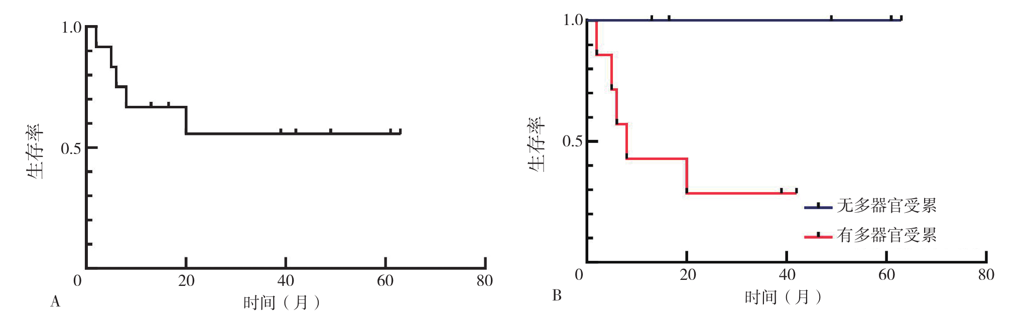 摘要: 背景 淀粉样变性患者临床表现多样且缺乏特异性,容易被漏诊、误诊,早期诊断及积极治疗对疾病预后至关重要。 目的 通过分析本中心诊断为淀粉样变性患者的临床特点及预后,提高对该疾病的认识。 方法 回顾性分析2015年1月—2023年10月于昆明医科大学附属延安医院69例确诊为淀粉样变性患者的临床资料,并通过电话随访收集患者生存情况,根据诊断为同种类型的淀粉样变性患者的生存结局分为死亡组与存活组。绘制患者的Kaplan-Meier生存曲线,进行Log-rank检验。 结果 共纳入69例淀粉样变性患者,其中脑血管淀粉样变性(CAA)35例,中位确诊年龄72(66,80)岁,临床特点主要为脑出血、认知障碍或痴呆,其中6例(17.1%)CAA患者初诊住院期间死于脑出血;皮肤淀粉样变性12例,中位确诊年龄67.0(53.5,75.5)岁,主要临床表现为胫前、四肢伸侧及背部等部位出现粟粒至绿豆大小的丘疹;喉淀粉样变性3例,主要表现为声音嘶哑、咽喉部不适、喉部异物感;多发性骨髓瘤(MM)合并轻链型淀粉样变性6例,平均年龄(60.8±9.0)岁,总体中位生存时间为3.5个月,5例(83.3%)患者有多器官受累(2个及以上器官受累),1例(16.7%)患者为单器官受累,6例患者均有水肿症状,5例(83.3%)伴有胸闷、气促,1例(16.7%)伴有骨痛,1例(16.7%)伴有四肢麻木,其中1例患者初诊时未开始治疗即死于心源性猝死;系统淀粉样变性13例[其中系统性轻链型(AL)淀粉样变性12例,AA型淀粉样变性1例],12例AL淀粉样变性患者多以乏力(10例,83.3%)、水肿(9例,75.0%)为首发症状,其次为泡沫尿(6例,50.0%)和胸闷(6例,50.0%),还可表现为气促、体质量减轻、肢体麻木、厌食、排便不规律等症状,其中累及1个器官者5例(41.7%),2个及以上器官受累者7例(58.3%),常见受累器官为肾脏(9例,75.0%)和心脏(8例,66.7%),其次为肝脏(3例,25.0%)。AL淀粉样变性患者死亡组24 h尿蛋白明显高于存活组(P<0.05)。Kaplan-Meier法分析结果显示AL淀粉样变性患者中位生存时间为18.3个月;Log-rank检验显示累及2个及以上器官的患者较累及单个器官的患者生存时间缩短(χ2=4.757,P=0.029)。MM合并轻链型淀粉样变性患者的总体中位生存时间为3.5个月,其中初诊死亡1例;MM合并轻链型淀粉样变性患者中,贫血患者生存时间较无贫血患者明显缩短(χ2=5.000,P=0.025);心功能Ⅳ级患者生存时间较心功能Ⅱ~Ⅲ级患者明显缩短(χ2=5.052,P=0.029);未接受治疗的患者生存时间较接受治疗的患者明显缩短(χ2=5.000,P=0.025)。 结论 淀粉样变性的临床表现多种多样,不同类型的淀粉样变性预后差异大;CAA为老年人易患病,且合并脑出血时急性期病死率高;MM合并轻链型淀粉样变性患者起病首发症状以淀粉样变性累及心、肾等重要器官的症状为主,有贫血及心功能分级Ⅳ级可能为预后不良因素,积极接受治疗可能为改善患者预后的有利因素;AL淀粉样变性患者累及多器官时提示预后不良。