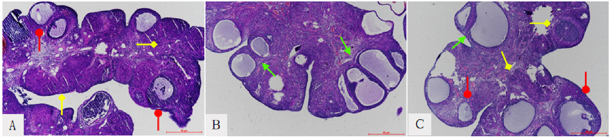 摘要: 背景 多囊卵巢综合征(PCOS)是一类尚无明确病因的妇科内分泌代谢性疾病,患病率日渐年轻化、普遍化,因此研究PCOS分子生物学层面的发病机制,可为临床治疗提供相关依据,守护女性健康。 目的 以中医学"痰湿"体质导致不孕的理论为依据,探讨二陈汤对PCOS卵巢颗粒细胞线粒体自噬依赖性铁死亡的改善作用。 方法 辽宁中医药大学实验动物中心提供SPF级实验室及32只SD雌性大鼠,适应性喂养1周后,随机将32只大鼠分为对照组(n=10)和模型组(n=22)。对照组给予普通维持饲料全程喂养,共12周;模型组全程给予高脂饲料喂养,造模期间每日给予来曲唑溶液灌胃。造模完毕选取动情周期紊乱的模型组大鼠作为治疗组(n=12),每日给予二陈汤煎剂灌胃,连续4周进行治疗。取材后对大鼠卵巢进行HE染色,观察病理变化,采用透射电镜拍摄3组大鼠卵巢颗粒细胞线粒体形态学变化,采用Western Blotting法检测大鼠卵巢颗粒细胞自噬相关基因7(ATG7)、P62、自噬相关蛋白1(Beclin1)、微管相关蛋白1轻链3-Ⅰ(LC3-Ⅰ)、微管相关蛋白1轻链3-Ⅱ(LC3-Ⅱ)、铁蛋白重链1(FTH1)、线粒体呼吸链组装蛋白2(ISCU2)蛋白水平变化。采用Oxygraph-2k线粒体功能测定系统检测卵巢颗粒细胞线粒体耗氧率变化。 结果 模型组大鼠卵巢囊性卵泡增多,黄体减少并且卵巢颗粒细胞线粒体出现自噬与铁死亡现象,治疗组治疗后形态部分恢复。与对照组相比,模型组ATG7、P62、Beclin1、LC3-Ⅱ蛋白水平升高(P<0.05),LC3-Ⅱ/LC3-Ⅰ升高(P<0.05),LC3-Ⅰ、FTH1、ISCU2蛋白水平降低(P<0.05);与模型组相比,治疗组ATG7、P62、Beclin1、LC3-Ⅱ蛋白水平降低(P<0.05),LC3-Ⅱ/LC3-Ⅰ降低(P<0.05),FTH1蛋白水平升高(P<0.05)。三组电子传递系统(ETS)、线粒体复合体Ⅰ(CⅠ)、线粒体复合体Ⅱ(CⅡ)耗氧率比较,差异有统计学意义(P<0.05);其中模型组ETS、CⅠ、CⅡ耗氧率低于对照组,治疗组ETS、CⅠ、CⅡ耗氧率高于模型组,差异均有统计学意义(P<0.05)。 结论 二陈汤通过ATG7/FTH1通路逆转卵巢颗粒细胞自噬依赖性铁死亡,改善痰湿型PCOS大鼠的卵泡功能。