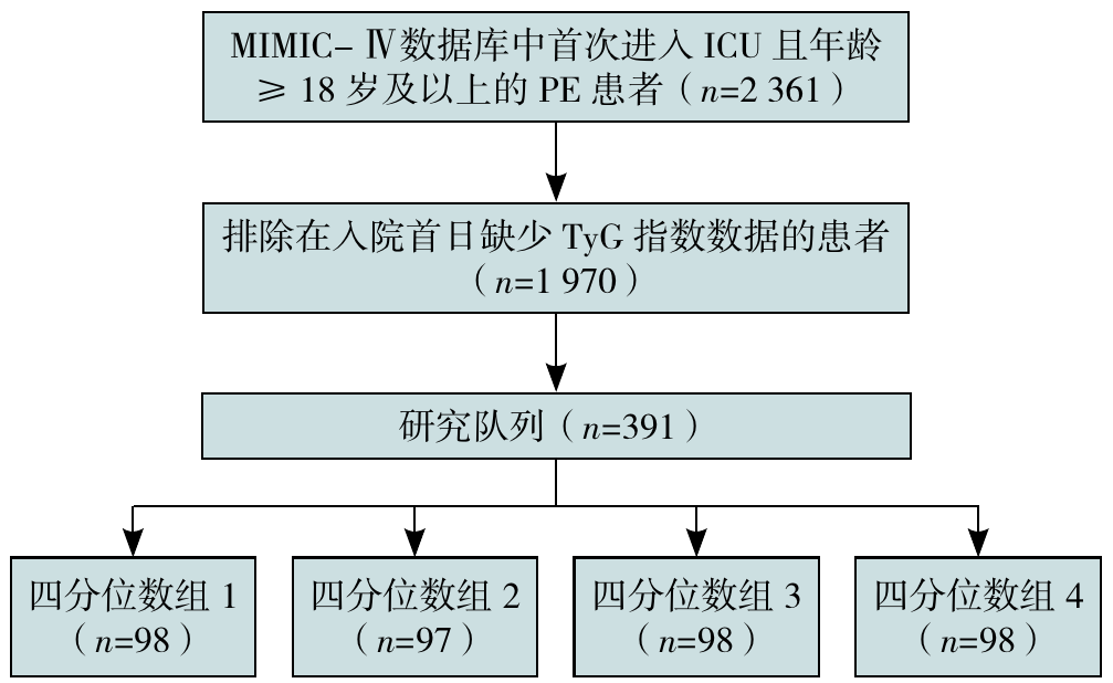 摘要: 背景 三酰甘油-葡萄糖(TyG)指数作为胰岛素抵抗(IR)的替代指标,与代谢综合征及肺栓塞(PE)的发病机制相关。 目的 探究TyG指数与重症PE患者临床预后之间的关联。 方法 本研究为回顾性队列研究,数据来源于重症监护医学信息数据库(MIMIC-Ⅳ)。选取该数据库中2008—2019年入住重症监护病房(ICU)的PE患者,根据其入ICU首日的TyG指数四分位数将患者分为4组。主要结局指标为住院期间的全因死亡率,包含住院死亡率和ICU死亡率。通过Cox比例风险回归分析和限制性立方样条(RCS)探索TyG指数与患者预后的关系。 结果 本研究共纳入391例患者,平均年龄为(62.2±16.5)岁。整个队列的平均TyG指数为(4.95±0.41)。观察到住院死亡率为19.18%(75/391),ICU内死亡率为10.23%(40/391)。根据入院时的TyG指数,将患者分为4个四分位组(TyG指数分别为Q1:3.81~4.68;Q2:4.69~4.90;Q3:4.91~5.18;Q4:5.19~7.05),分别为98、97、98、98例。调整自变量后Cox比例风险回归分析结果显示:随着TyG指数升高,PE患者住院死亡风险(HR=4.14,95%CI=1.40~12.28,P=0.010)、ICU死亡风险(HR=6.45,95%CI=1.27~32.60,P=0.024)均增加。相较于Q1,TyG指数位于Q4的PE患者住院死亡风险增加(HR=4.17,95%CI=1.33~13.03,P=0.014)。RCS结果显示,随着TyG指数的升高,住院死亡率和ICU死亡率呈线性增加(P非线性值分别为0.833、0.669)。 结论 重症PE患者的全因死亡率与TyG指数之间存在显著关联,提示TyG指数可作为预测住院及ICU死亡风险有价值的指标。