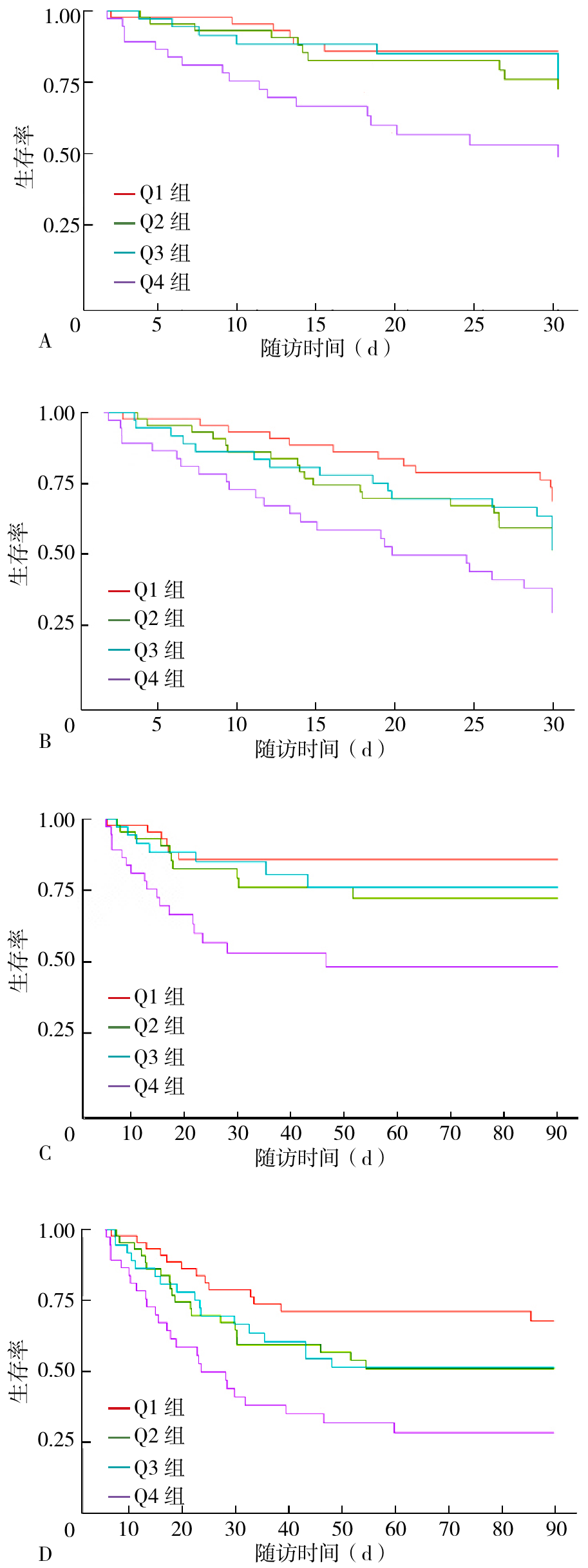 图2 不同TyG指数四分位数分组患者住院死亡率和ICU死亡率的Kaplan-Meier图注:三酰甘油-葡萄糖(TyG)指数四分位数分组:Q1(3.81~4.68),Q2(4.69~4.90),Q3(4.91~5.18),Q4(5.19~7.05)。A、B分别为各组随访1个月时重症监护病房(ICU)死亡率和住院死亡率,C、D分别为各组随访3个月时ICU死亡率和住院死亡率。