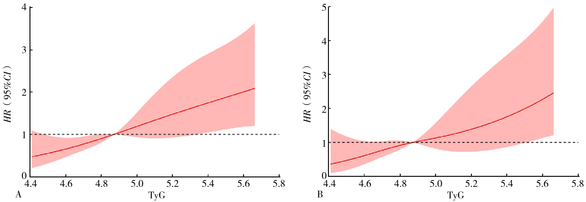 图3 TyG指数对PE患者住院死亡率和ICU死亡率的限制性立方样条图注:A为住院死亡率曲线,B为ICU死亡率曲线。