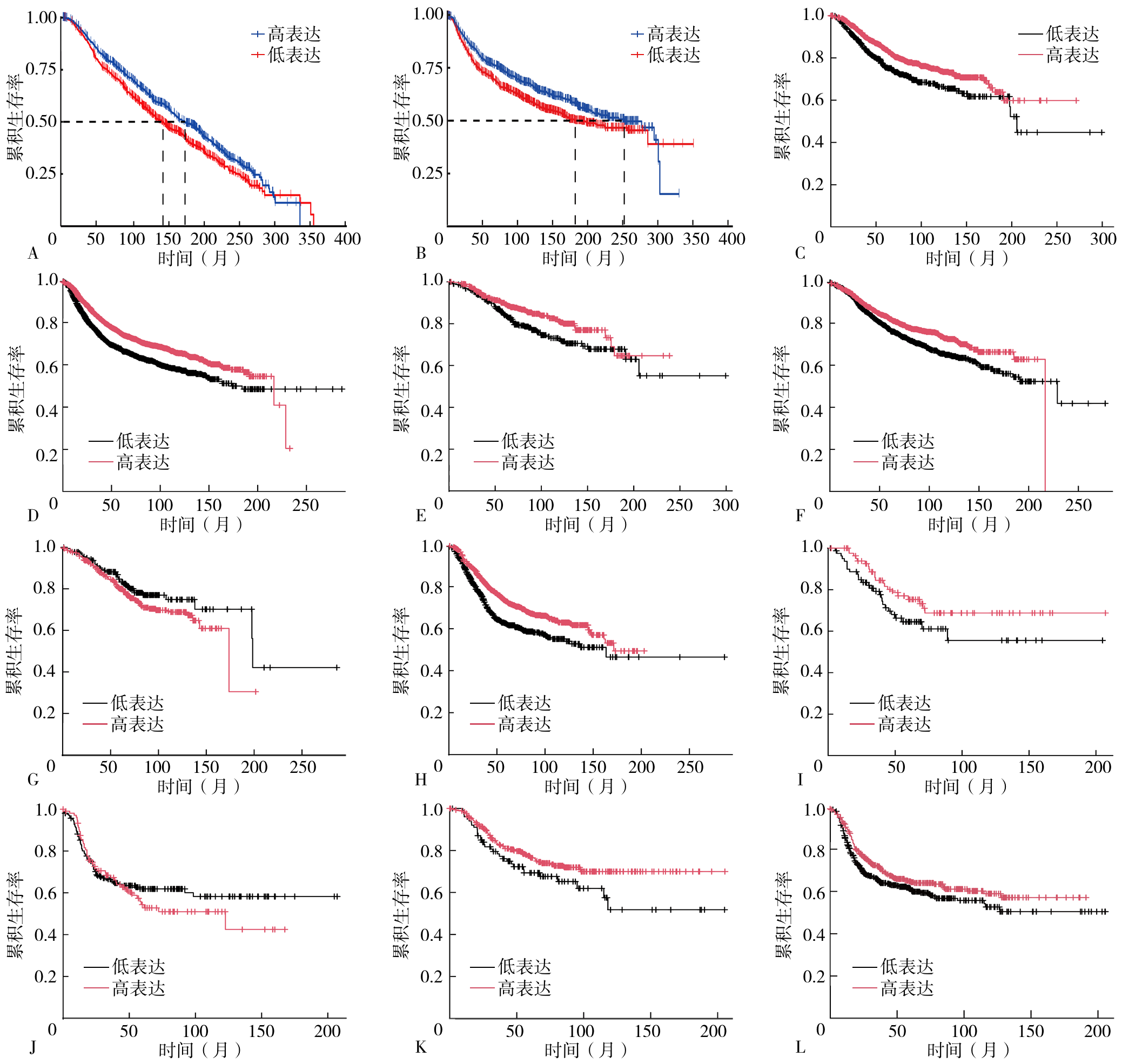 Immunohistochemical staining and RT-qPCR detection results showed that the relative expression levels of Gas6 protein and mRNA in breast cancer tissues were lower than those in adjacent non-cancerous tissues (P<0.001). In contrast, the relative expression levels of AXL protein and mRNA in breast cancer tissues were higher than those in adjacent non-cancerous tissues (P<0.001). Spearman correlation analysis based on the databases revealed that there was a positive correlation between Gas6 and AXL mRNA expression in the total breast cancer population and four subtypes of patients (rs=0.480, P<0.001). Moreover, statistically significant differences were observed in Gas6 mRNA expression levels among patients with different breast cancer molecular subtypes, primary tumor stages, histological grades, chemotherapy treatments and regional lymph node stages (P<0.05). Kaplan-Meier survival analysis indicated that in the overall breast cancer population and among patients with Luminal A subtype, the group with high Gas6 mRNA expression in cancerous tissues had a longer OS and RFS compared to the low expression group. Additionally, for Luminal B subtype patients, RFS of the high Gas6 mRNA expression group in cancerous tissues is also longer than that of the low expression group, with these differences being statistically significant (P<0.05) .