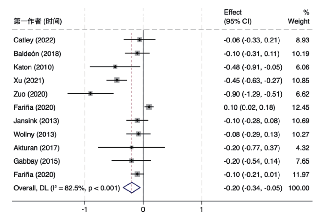 | 10 h及以上 | 11 | 6 361 | 62% | 0.004 | -3.05(-4.65~-1.46) | 0.001 | ||