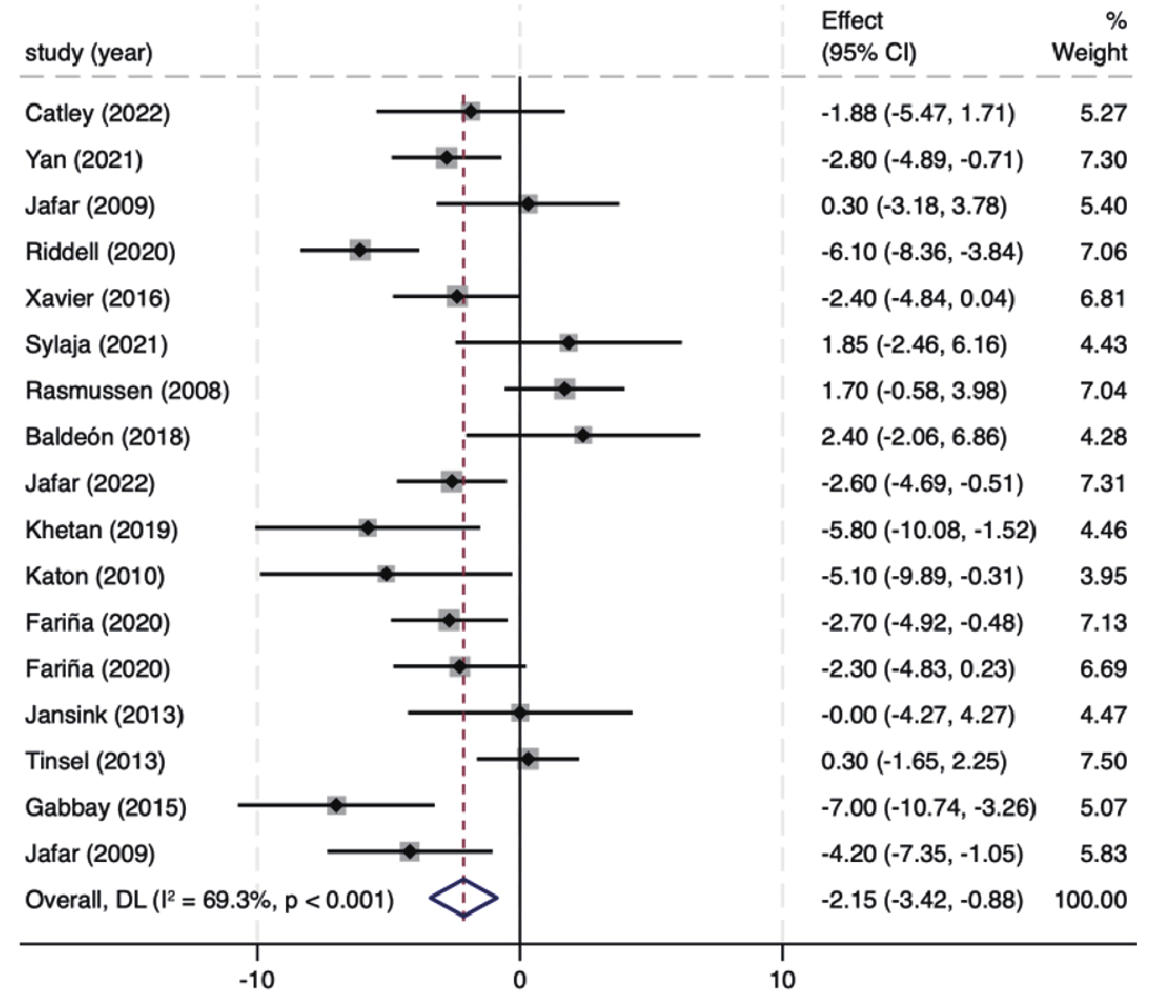 | SBP | 17 | 11 353 | 69% | <0.001 | 随机 | -2.15(-3.42~-0.88) | 0.001 | 0.005 |