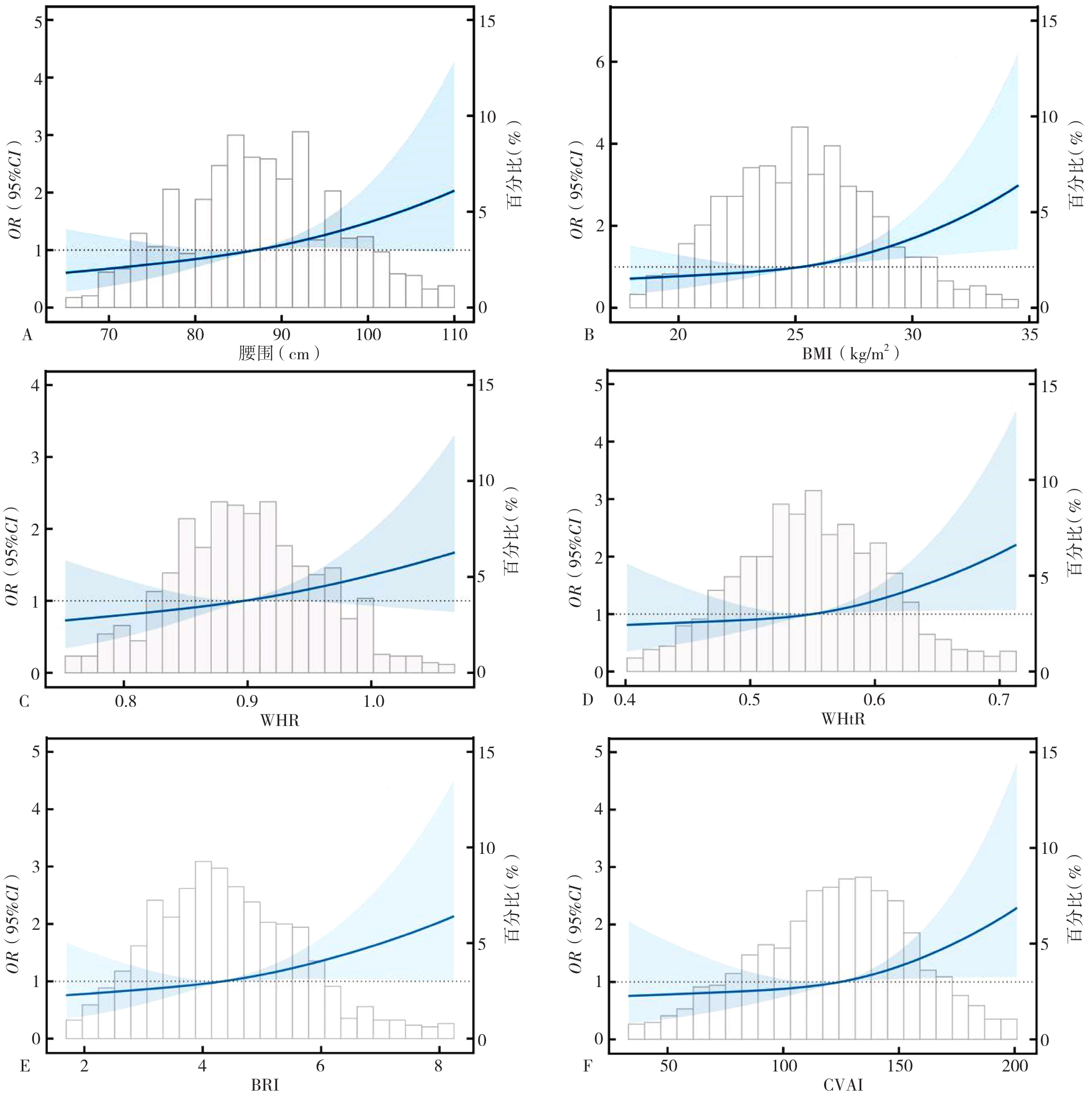 图1 老年人肥胖指标与衰弱相关性的剂量-反应关系注:A~F分别表示腰围、BMI、腰臀比(WHR)、腰高比(WHtR)、身体圆度指数(BRI)、中国内脏脂肪指数(CVAI)与衰弱相关性的剂量-反应关系曲线;模型调整同模型3。