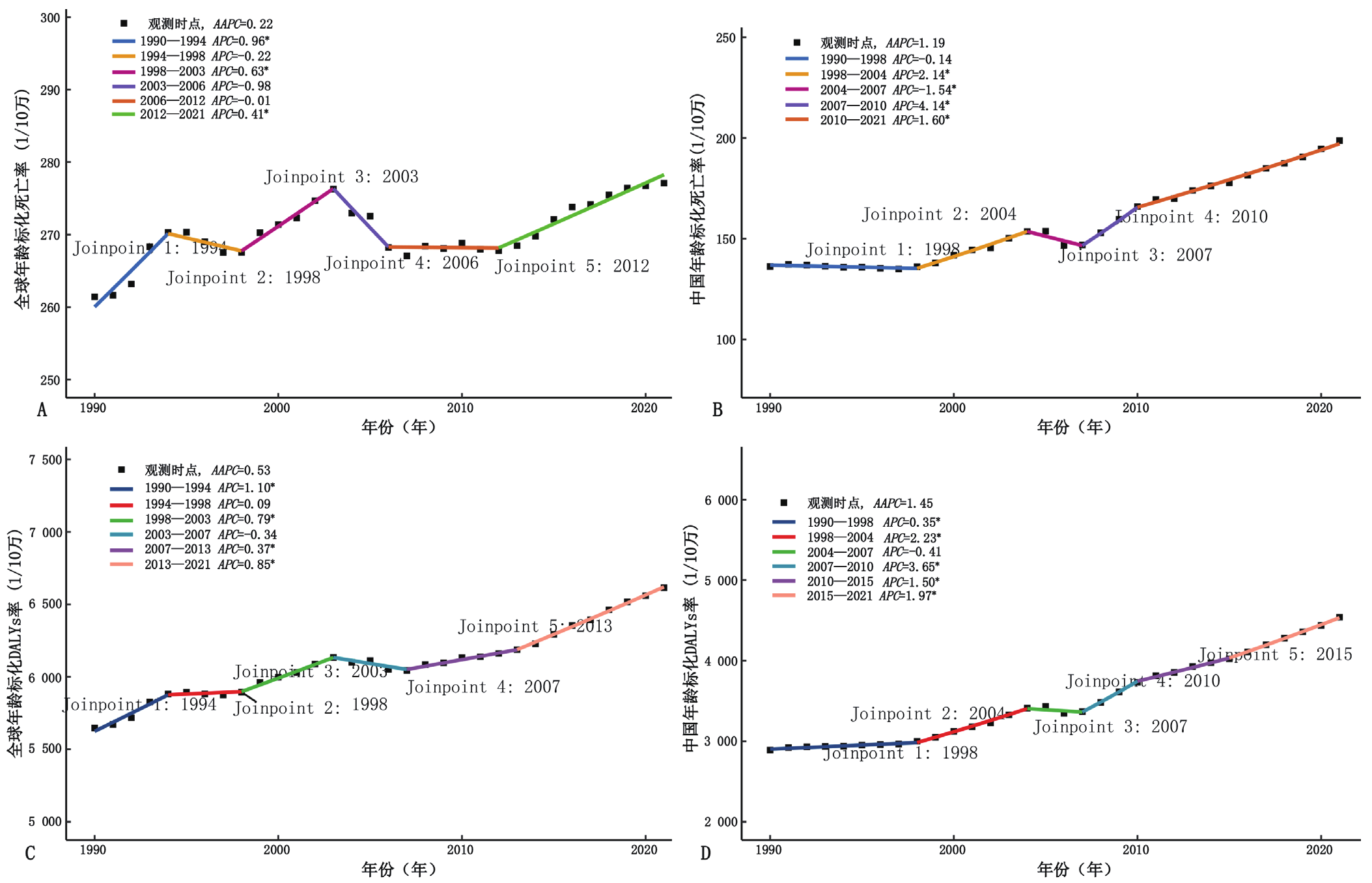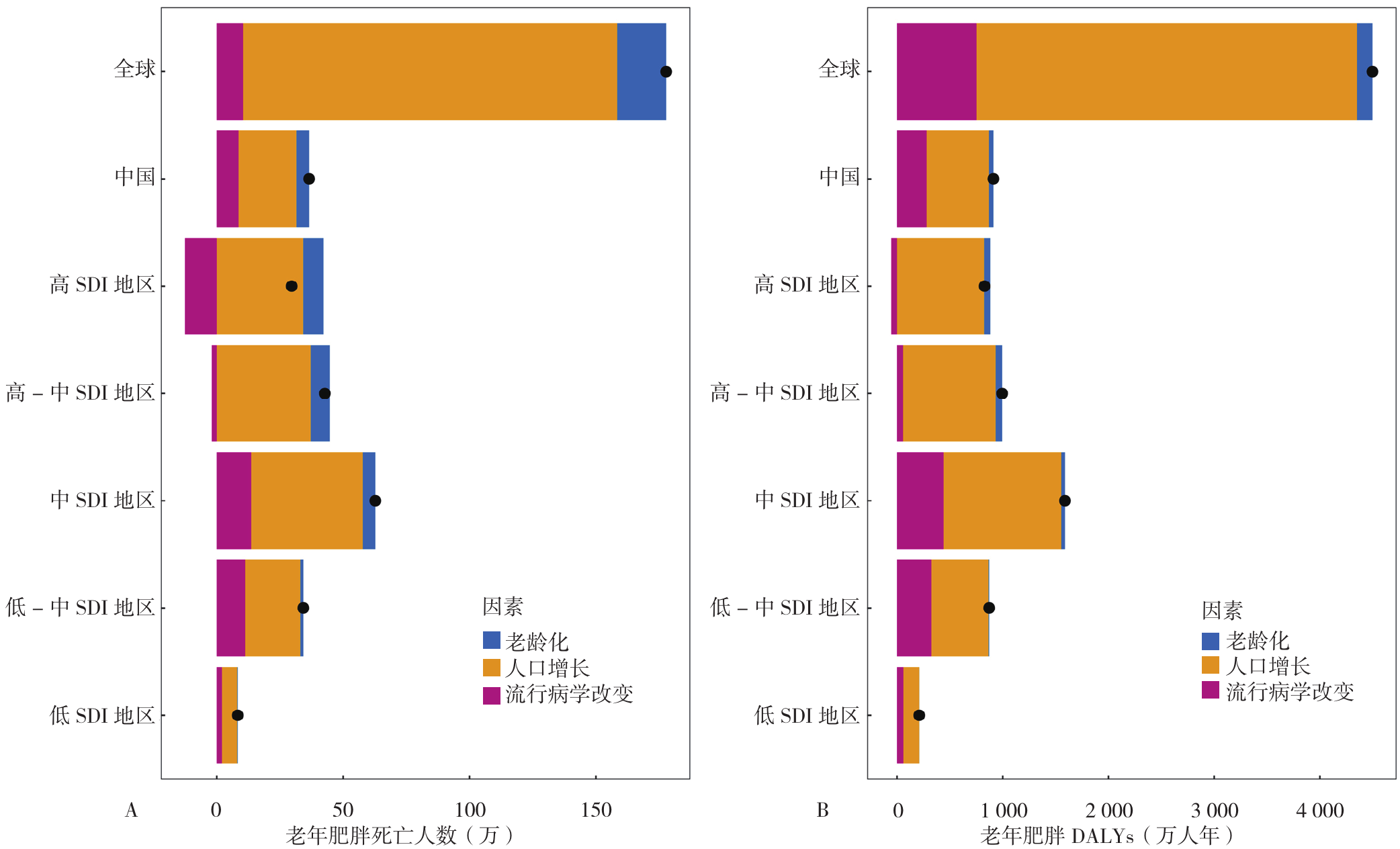 摘要: 背景 肥胖与老龄化已成为全球范围内的重大公共卫生问题,且老龄化问题在我国尤为突出,但目前关于老年人群肥胖的疾病负担研究证据相对较少,亟需填补。 目的 分析1990—2021年全球和中国老年人群的肥胖疾病负担并预测其未来变化趋势,为制定相关公共卫生防控政策与开展医疗卫生决策提供科学依据。 方法 从全球疾病负担(GBD)2021数据库中获取全球、中国及5个社会人口学指数(SDI)地区年龄≥60岁人群"high body-mass index"相关的死亡和伤残调整生命年(DALYs)数据。利用Joinpoint回归分析年龄标化死亡率(ASMR)和年龄标化DALYs率(ASDR)随时间的变化趋势,结果以平均年度变化百分比(AAPC)及其95%CI呈现。运用三因素分解分析方法评估老龄化、人口增长及流行病学变化对疾病负担变化的相对影响,并基于贝叶斯年龄-时期-队列(BAPC)模型预测2022—2035年死亡人数与DALYs的变化趋势。 结果 2021年全球与中国老年总体人群肥胖死亡人数分别为288.04万人、46.70万人,较1990年分别增加了161.26%、359.19%;DALYs则分别为7 119.34万人年、1 176.36万人年,较1990年分别增加了171.50%、344.80%。同时,1990—2021年全球老年总体和男性人群肥胖的ASMR总体上均呈上升趋势,其AAPC分别为0.22%(95%CI=0.08%~0.36%,P=0.002)、0.43%(95%CI=0.31%~0.55%,P<0.001);1990—2021年中国老年总体、女性、男性人群肥胖的ASMR总体上也均呈上升趋势,AAPC分别为1.19%(95%CI=0.97%~1.40%,P<0.001)、1.01%(95%CI=0.80%~1.23%,P<0.001)和1.47%(95%CI=1.16%~1.77%,P<0.001)。1990—2021年全球老年总体、女性、男性人群肥胖的ASDR总体上均呈上升趋势,AAPC分别为0.53%(95%CI=0.44%~0.62%,P<0.001)、0.43%(95%CI=0.33%~0.54%,P<0.001)和0.69%(95%CI=0.60%~0.79%,P<0.001);1990—2021年中国老年总体、女性、男性人群肥胖的ASDR总体上也均呈上升趋势,其AAPC分别为1.45%(95%CI=1.32%~1.58%,P<0.001)、1.34%(95%CI=1.21%~1.47%,P<0.001)和1.60%(95%CI=1.41%~1.79%,P<0.001)。此外,2021年5个SDI地区老年人群肥胖的死亡人数和DALYs相较于1990年也均有不同程度的增加。2021年全球和中国老年人群肥胖DALYs占比最高的年龄组分别为60~64岁组(1 650.05万人年,23.18%)和65~69岁组(293.02万人年,24.91%)。分解分析表明,人口增长是各地区疾病负担增加的主要影响因素。BAPC预测模型表明,2035年全球老年总体人群肥胖的死亡人数和DALYs较2021年将分别增长66.33%、71.93%,而中国将分别增长151.17%、135.03%。 结论 全球与我国老年人群肥胖疾病负担依然沉重且预计未来将会持续加剧,可通过加强公众健康意识,提倡健康生活方式并合理联合使用药物及手术等多维度干预来遏制不断增加的肥胖负担。