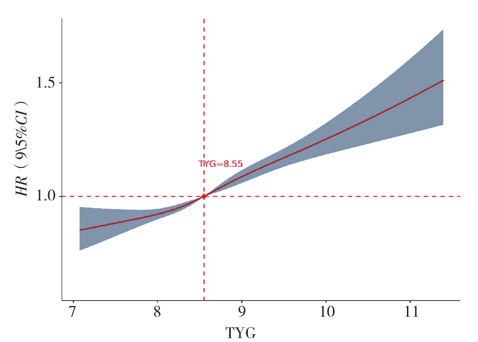 A total of 46 754 participants were included, comprising 19 884 males (42.5%) and 26 870 females (57.5%), with a median age of 69(65, 73) years. The mean baseline TYG was 8.59±0.60, and 32 837 (70.2%) participants were at CKM stage 2. Cox regression analysis revealed that per unit increase in TYG as a continuous variable was associated with a 19.4% increased risk of CVD incidence (HR=1.194, 95%CI=1.162-1.226, P<0.001). Group analysis indicated that the risk of newly developed CVD in Q4 was 28.0% higher than in Q1 (HR=1.280, 95%CI=1.222-1.341), with a significant dose-response relationship (P<0.05). Cumulative incidences of CVD across Q1-Q4 showed a gradient increase (33.7%, 35.2%, 42.0%, and 43.7%, respectively). Kaplan-Meier curves demonstrated statistically significant differences in CVD incidence rates among Q1-Q4 groups (χ2=328.853, P<0.05). RCS analysis suggested a linear positive correlation between TYG and CVD risk in the overall CKM stages 0-3 population (P<0.001, Pnon-lineari=0.282); stratification by CKM stage also showed a linear positive correlation in CKM stages 0-1 (P<0.001, Pnon-linear=0.616) and 2-3 (P<0.001, Pnon-linear=0.180).