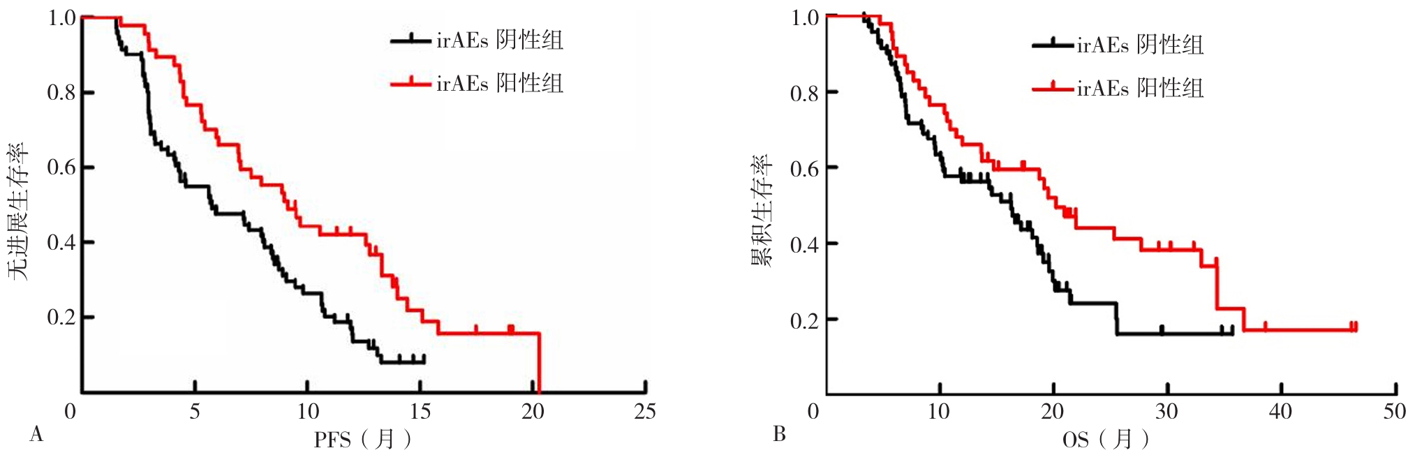 Among the 118 patients, 47 cases (39.83%) experienced irAEs. The irAEs with higher incidence were dermal toxicity 21 cases (17.80%), endocrine toxicity 16 cases (13.56%) and pulmonary toxicity16 cases (13.56%). The comparison of autoantibody profiles and antinuclear antibody (ANA) between the irAEs-positive group and the irAEs-negative group showed a statistically significant difference (P<0.05). Univariate Logistic analysis showed that autoantibody profile positivity (OR=3.375, 95%CI=1.527-7.456, P=0.003) and ANA positivity (OR=3.072, 95%CI=1.404-6.722, P=0.005) were risk factors for the development of irAEs (P<0.05). Multivariate Logistic analysis showed that autoantibody profile positivity (OR=2.367, 95%CI=0.841-6.663, P=0.103) and ANA positivity (OR=1.733, 95%CI=0.621-4.837, P=0.293) were not significantly associated with the occurrence of irAEs. However, the incidence of endocrine toxicity was higher in autoantibody-positive patients than in autoantibody-negative patients, and the incidence of endocrine toxicity and myotoxicity was higher in ANA-positive patients than in ANA-negative patients (P<0.05). Moreover, the DCR of irAEs-positive group was longer than that of irAEs-negative group (χ2=6.690, P=0.010). Comparing the ORR of the two groups, the difference was not statistically significant (χ2=2.628, P=0.105). Survival analysis results showed that the median PFS and median OS of the irAEs-positive group were longer than those of the irAEs-negative group, all differences were statistically significant (PFS: χ2=9.521, P=0.002; OS: χ2=4.254, P=0.039).