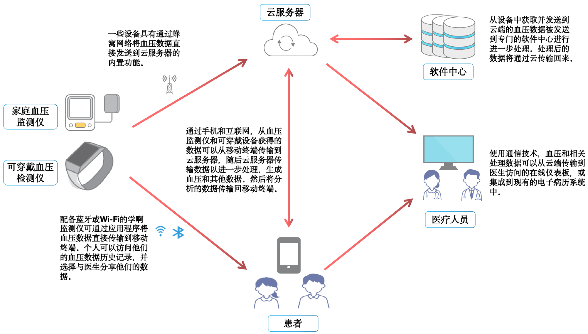 | 技术问题 | 需要专门针对此类设备设计的新型验证流程(比袖带式血压设备要求更高) 新型无袖带监测设备需重复校准 专有技术的使用(不同设备记录的血压是否一致不明确,尤其影响无袖带血压设备) "黑箱"方法比示波法更难理解(如机器学习/深度学习/神经网络) 设备须具备足够的存储空间记录测量值或传输数据至应用程序 应用程序需配备系统警报,避免对患者和/或医疗团队过度提醒 |