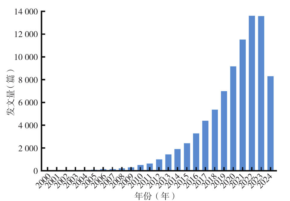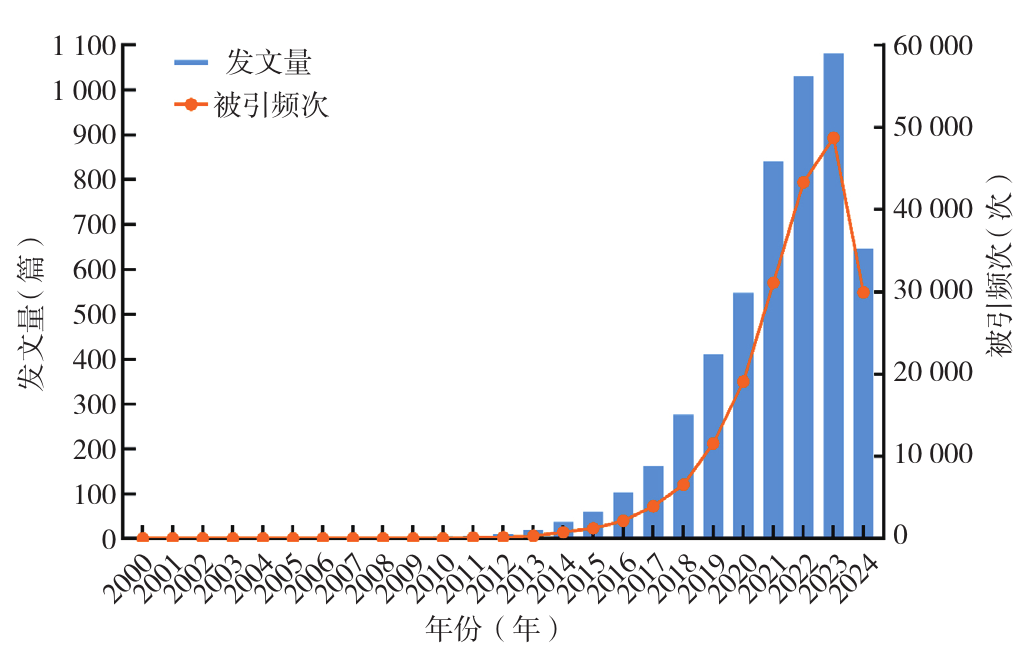图3 2000—2024年神经系统疾病与肠道菌群相关文献发文量及被引频次