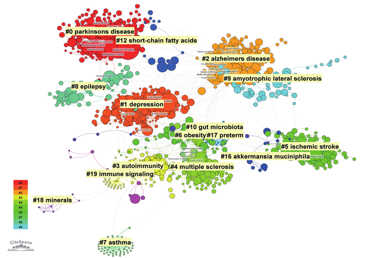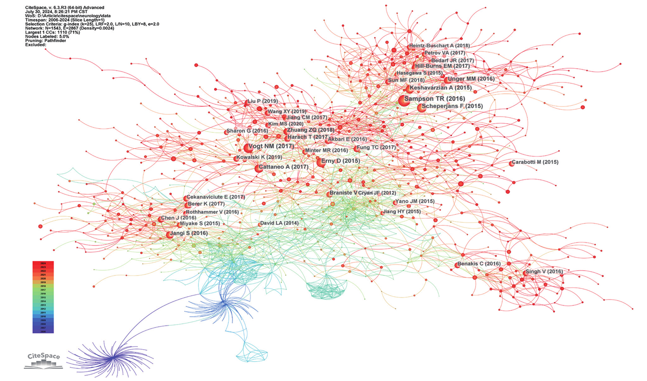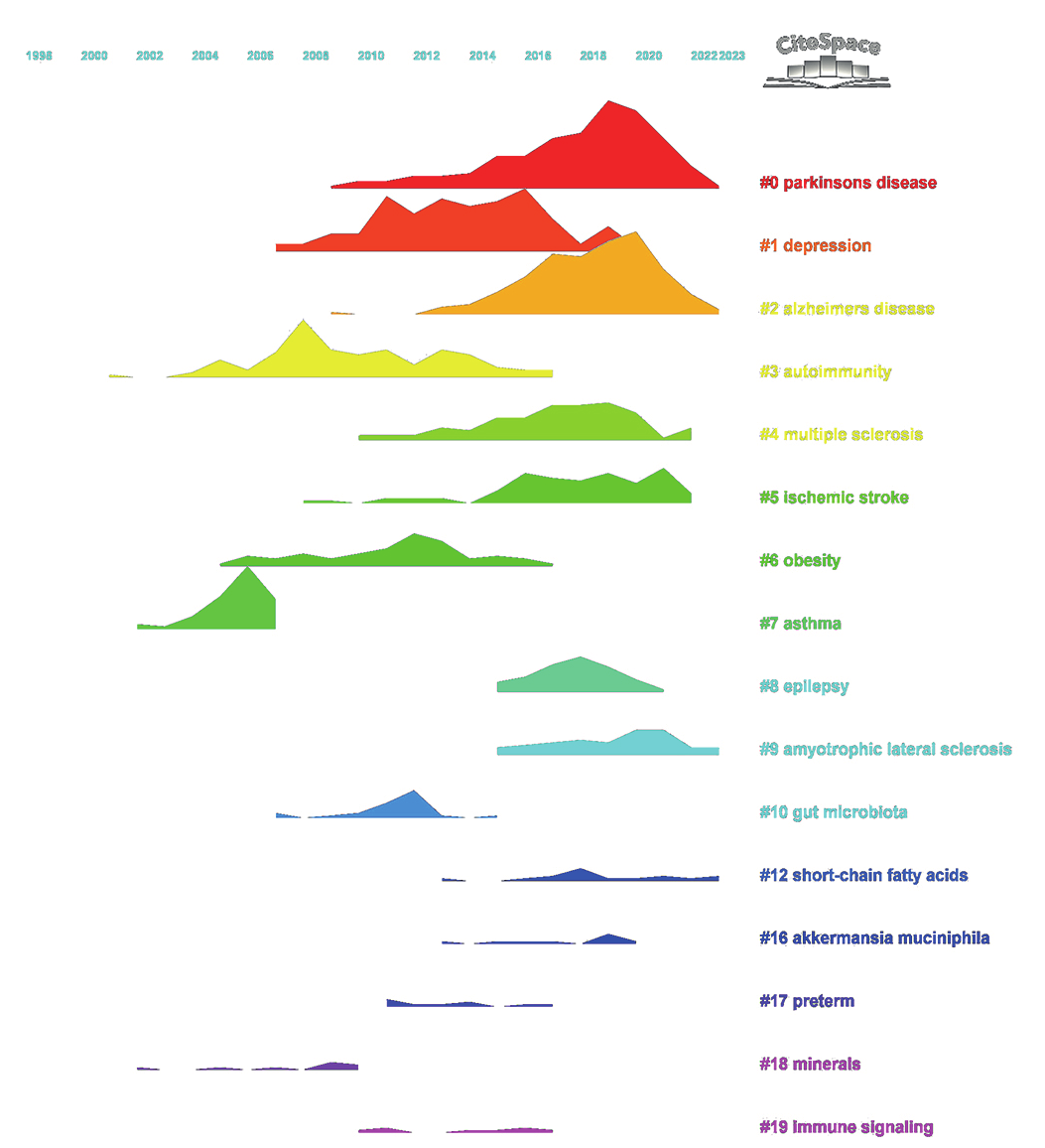 Table 1 Summary of information for the 16 largest clusters in the co-citation network of neurological diseases and gut microbiota in 2005-2024