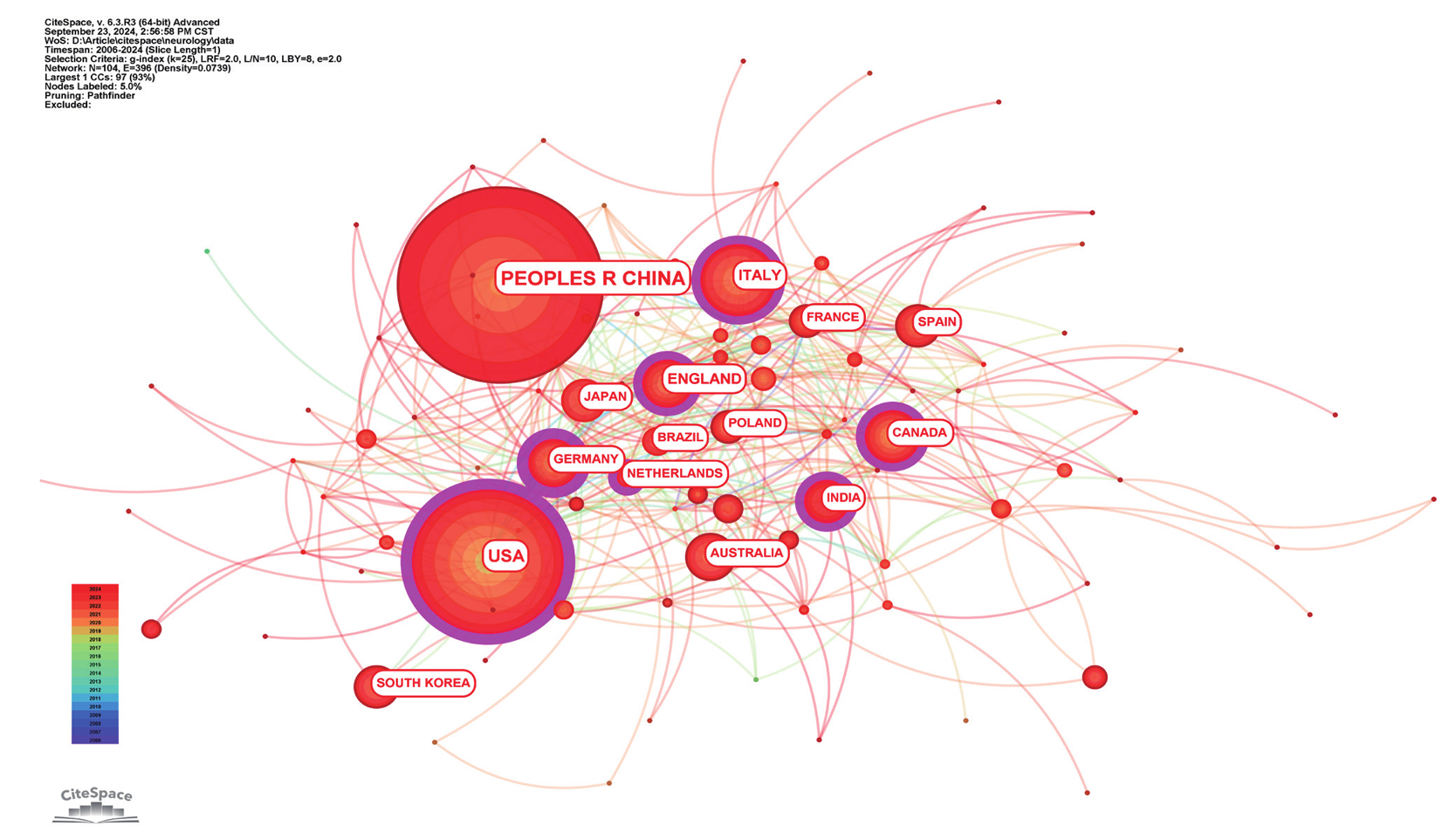 摘要: 背景 神经系统疾病严重影响患者生活质量,其复杂病因涉及遗传、感染、免疫等多种因素。近年来,关于肠道微生物群通过肠-脑轴参与神经系统疾病发生、发展的研究引起了广泛关注,但相关研究热点和发展趋势尚未得到系统梳理。 目的 对神经系统疾病与肠道菌群相关文献进行可视化分析,以了解国内外研究的现状,探索其热点和前沿趋势,为未来的研究提供参考依据。 方法 检索Web of Science数据库核心合集中自2000-01-01—2024-07-29的相关文献,运用CiteSpace软件从发文量、文献共被引、高被引文献、引文激增文献、关键词共现、国家合作、机构合作及作者合作等多个方面进行可视化分析。 结果 共纳入5 239篇文献,自2012年以来,发文量逐年上升,2022年年发文量超过1 000篇。研究热点主要集中于帕金森病、阿尔茨海默病、缺血性卒中及肌萎缩侧索硬化症等领域。文献共被引分析显示,肠道菌群与神经系统疾病的关系正成为近年来的研究重点。关键词共现分析进一步明确了短链脂肪酸、肠-脑轴、肠道菌群失调等重要研究主题的频繁出现,反映了对这些方向的高度关注。高被引文章和引文激增文献分析显示,研究趋势主要集中在肠道微生物对神经退行性疾病及中枢神经系统其他疾病的影响机制上,尤其是短链脂肪酸、肠道菌群多样性和肠-脑轴的调控作用。 结论 基于CiteSpace的文献计量学分析可见肠道菌群与多种神经系统疾病(如帕金森病、阿尔茨海默病、多发性硬化症等)之间的潜在关联,通过干预微生物群失调有望为神经系统疾病的治疗开辟新的方向。进一步的纵向研究和临床试验将有助于验证这一观点,揭示肠道菌群在神经系统疾病中的作用机制。