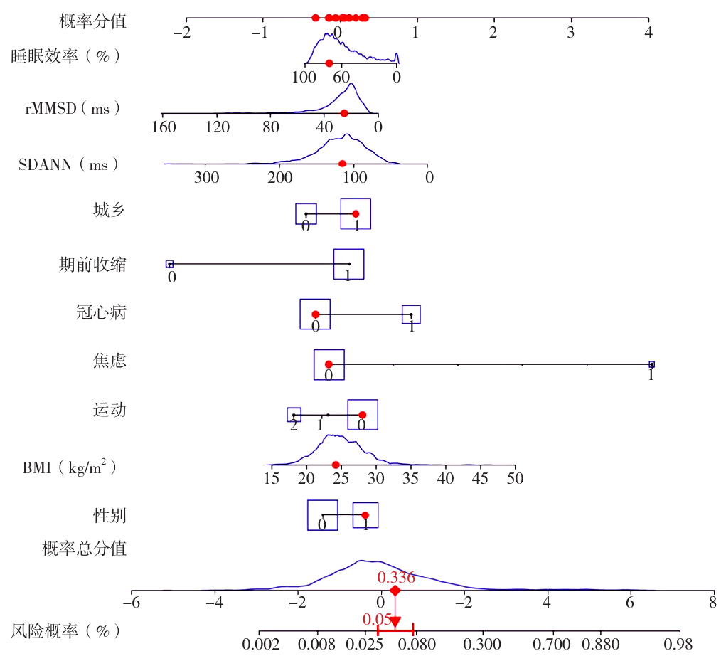 摘要: 背景 心血管代谢疾病与抑郁密切相关。基层心血管代谢疾病管理工作已初具规模,但对于患者抑郁等心理问题一方面缺乏关注,另一方面缺乏简单、准确、高效的筛查评估工具。 目的 应用单导联可穿戴心电设备构建宁夏基层老年心血管代谢疾病患者抑郁发生风险的列线图预测模型并验证。 方法 选取2022年1月—2023年6月宁夏地区5个市的20家基层医疗卫生机构应用单导联可穿戴心电设备采集并上传至云平台的3 121例65岁以上高血压、糖尿病、冠心病等心血管代谢疾病患者的心电图资料及云平台收集的患者社会人口学、生活行为方式、心理健康等资料。采用简单随机抽样方法按3∶1比例分为训练集(2 341例)和验证集(780例)。通过运行RStudio 4.1.1软件,使用LASSO回归分析以及交叉验证筛选最佳预测因子,采用多因素Logistic回归分析构建预测老年心血管代谢疾病患者抑郁发生风险的列线图预测模型,采用受试者工作特征(ROC)曲线、校正曲线及决策曲线评估模型的效能。 结果 LASSO回归筛选出10个变量:性别、BMI、城乡、运动、焦虑、冠心病、期前收缩、RR间期平均值标准差(SDANN)、正常相邻窦性RR间期差值均方根(rMSSD)、睡眠效率;多因素Logistic回归分析结果显示,性别(OR=1.747,95%CI=1.258~2.434)、BMI(OR=1.073,95%CI=1.024~1.125)、城乡(OR=1.684,95%CI=1.172~2.456)、运动(OR=0.610,95%CI=0.460~0.799)、焦虑(OR=3.041,95%CI=1.597~5.484)、冠心病(OR=2.743,95%CI=1.971~3.815),期前收缩(OR=4.745,95%CI=1.681~19.977)、SDANN(OR=4.745,95%CI=1.681~19.977)、rMSSD(OR=0.986,95%CI=0.972~0.999)、睡眠效率(OR=0.988,95%CI=0.982~0.995)是老年心血管代谢疾病患者抑郁发生风险的影响因素(P<0.05)。Logistic回归方程Logit(P)=4.322+0.558×性别+0.071×BMI+0.521×城乡-0.494×运动+1.112×焦虑+1.009×冠心病+1.557×期前收缩-0.011×SDANN-0.014×rMSSD-0.012×睡眠效率,基于此构建列线图预测模型,在训练集和验证集中预测老年慢性病患者抑郁发生风险的ROC曲线下面积分别为0.748(95%CI=0.707~0.786,P<0.001)、0.751(95%CI=0.692~0.809,P<0.001),灵敏度分别为75.2%、76.7%,特异度分别为63.4%、60.6%。临床决策曲线显示,在训练集和验证集中当抑郁风险阈值概率分别在8%~35%、8%~37%时,预测老年心血管代谢疾病患者抑郁发生风险的净收益更高。 结论 性别、BMI、城乡、运动、焦虑、冠心病、期前收缩、SDANN、rMSSD、睡眠效率均是老年心血管代谢疾病患者抑郁发生风险的影响因素。本研究基于单导联可穿戴心电设备构建基层老年心血管代谢疾病患者抑郁发生风险的列线图模型,有较好的预测效能及临床应用价值,不但有助于在基层医疗卫生机构对患者进行抑郁筛查与个体化干预措施的制订,还可助力基层心血管疾病防控工作。