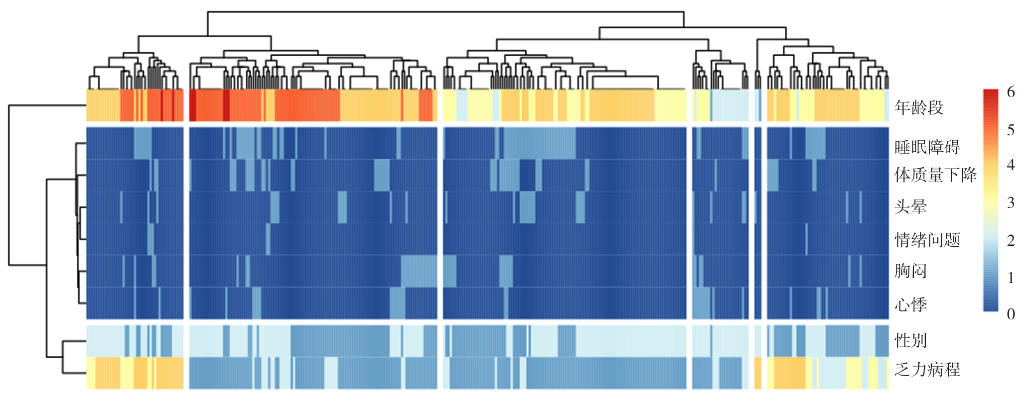 图5 新冠后乏力患者合并症状分层聚类分析树状及热图