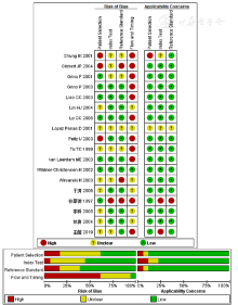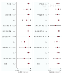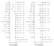 本研究具有以下优势:在充分纳入中英文相关文献的基础上,采用Meta回归和亚组分析方法评估异质性来源,同时将两项诊断性试验进行了间接比较,应用了两种实现诊断性试验网络Meta分析的方法,即多试验SROC曲线图法和调整间接比较法。本研究的局限性:(1)部分纳入文献的样本量较少,易产生偏倚;(2)纳入的研究中仅LIAO等[16]研究了不同诊断试验串并联使用的准确性,因而无法优选得出不同诊断试验串并联使用的最佳组合,亦无法评价组合间的可行性和成本效益。