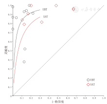 采用SPSS 26.0软件计算灵敏度对数与(1-特异度)对数的Spearman相关系数,探索阈值效应。运用Stata/MP 16.0软件的midas命令拟合双变量混合效应模型(实质为随机效应模型)[5,6]。利用midas命令检验研究间的异质性,利用I2值定量判断异质性大小,I2>50%说明存在高度异质性,则进行Meta回归分析,探讨异质性来源,其中"平均取样时间"(1 d;2~3 d;>3 d;未报道)采用哑变量的形式,若出现了有些哑变量有统计学差异,有些无统计学差异的情况,则在模型中纳入所有的哑变量以保证哑变量代表含义的正确性。计算各文献的合并灵敏度、特异度、阳性似然比、阴性似然比、诊断比值比及其95%可信区间(CI),并估计综合受试者工作特征(SROC)曲线下面积。采用Deek漏斗图法进行发表偏倚的评估。两个诊断试验之间的调整间接比较,以H.pylori感染复合检测作为共同的H.pylori感染判定标准,UBT(假设为a)和判定标准(假设为c)直接比较的合并诊断比值比为DORac,SAT(假设为b)与判定标准直接比较的合并诊断比值比为DORbc,则UBT与SAT之间的相对诊断比值比即为RDORab。将诊断指标看作比值比进行处理,计算UBT和SAT间接比较的效应量诊断比值比的对数lnDORab和标准误SelnDORab,运用ITC软件计算二者的相对比值及其可信区间,若可信区间不包含1,即上下限均大于1或上下限均小于1时,有统计学差异;若包含1时则无统计学差异[7,8]。以P<0.05为差异有统计学意义。