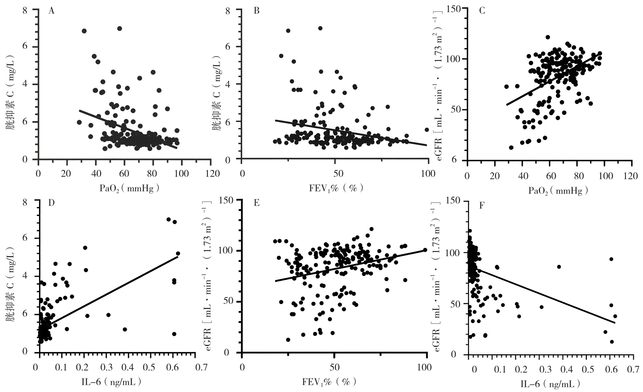 Table 5 Correlation analysis of eGFR,Cys C with PaO2,FEV1%,FEV1/FVC,and IL-6