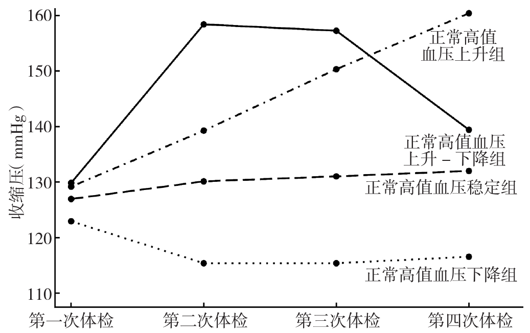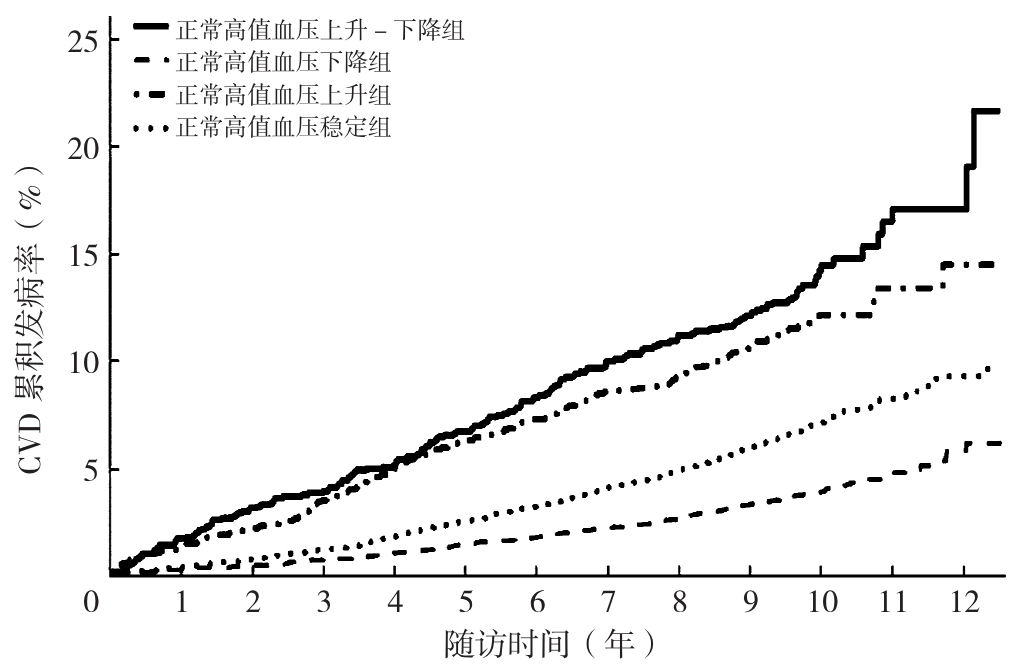 | 正常高值血压下降组 | 4 856 | 54.4±11.4 | 3 366/1 490 | 24.0±3.1 | 1 245(25.64) | 3 611(74.36) | 1 337(27.53) | 1 255(25.84) | 392(8.07) |