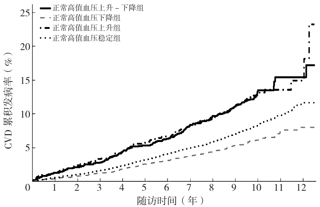 | 正常高值血压上升-下降组 | 2.20(1.52~3.20) | <0.01 | 2.11(1.40~3.17) | <0.01 | 2.39(1.57~3.63) | <0.01 | 2.34(1.48~3.71) | <0.01 | 1.61(0.89~2.91) | 0.32 | 1.32(0.69~2.55) | 0.63 |