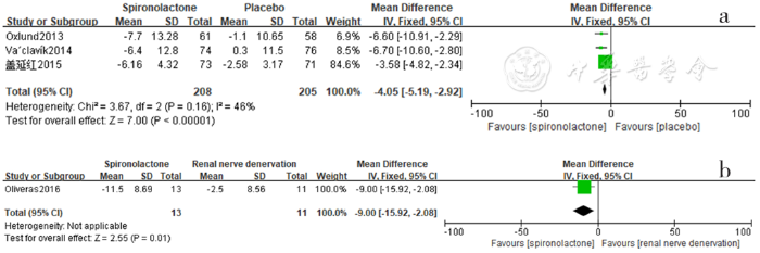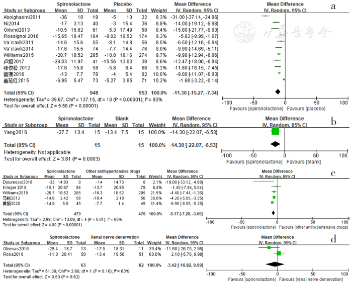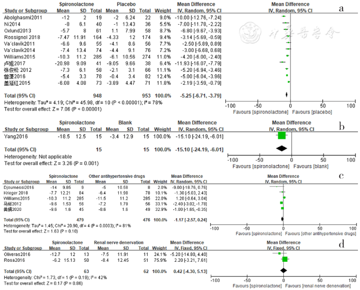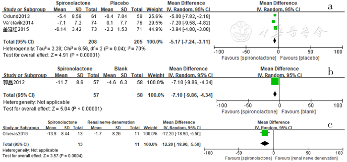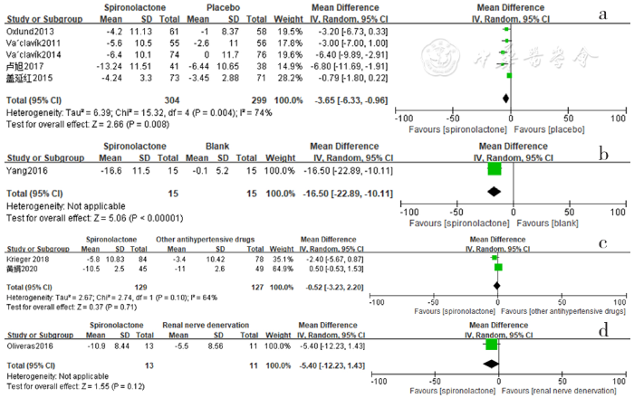 Forest plot of the effect of reducing 24-hour ambulatory systolic blood pressure of spironolactone versus placebo,no-treatment(blank),other antihypertensive drugs and renal sympathetic denervation