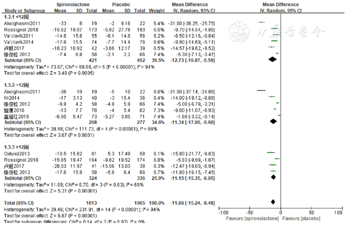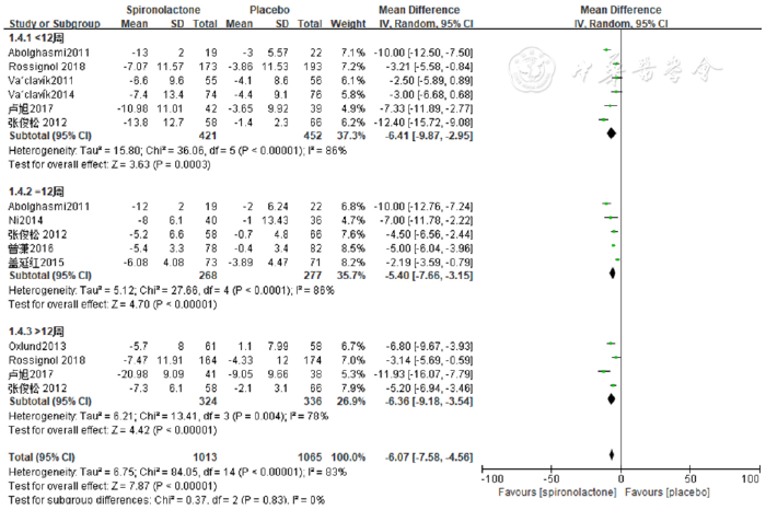 依随访时间行亚组分析,共纳入10篇文献[4,5,8,9,10,11,13,18,19,21]。随访时间<12周亚组行异质性检验,收缩压:I2=94%,P<0.000 01;舒张压:I2=86%,P<0.000 01。采用随机效应模型分析,结果显示:与安慰剂组相比,螺内酯组能有效降低诊室血压,差异有统计学意义〔收缩压:WMD=-12.73,95%CI(-19.87,-5.59),P=0.000 5;舒张压:WMD=-6.41,95%CI(-9.87,-2.95),P=0.000 3〕。随访时间12周亚组行异质性检验,收缩压:I2=96%,P<0.000 01;舒张压:I2=86%,P<0.000 1;采用随机效应模型分析,结果显示:与安慰剂组相比,螺内酯组能有效降低诊室血压,差异有统计学意义〔收缩压:WMD=-11.34,95%CI(-17.09,-5.60),P=0.000 1;舒张压:WMD=-5.40,95%CI(-7.66,-3.15),P<0.000 01〕;随访时间>12周亚组行异质性检验,收缩压:I2=66%,P=0.03;舒张压:I2=78%,P=0.004;采用随机效应模型分析,结果显示:与安慰剂组相比,螺内酯组同样能有效降低诊室血压,差异有统计学意义〔收缩压:WMD=-11.15,95%CI(-15.35,-6.95),P<0.000 01;舒张压:WMD=-6.36,95%CI(-9.18,-3.54),P<0.000 01〕,见图4和图5。
