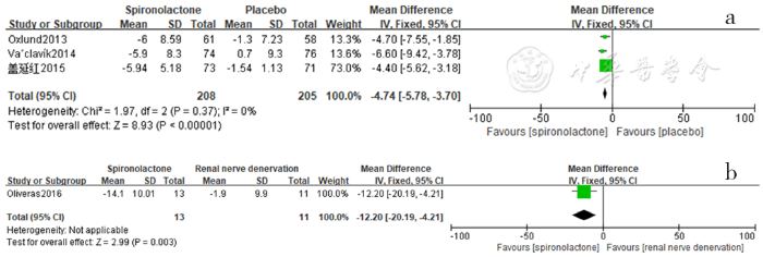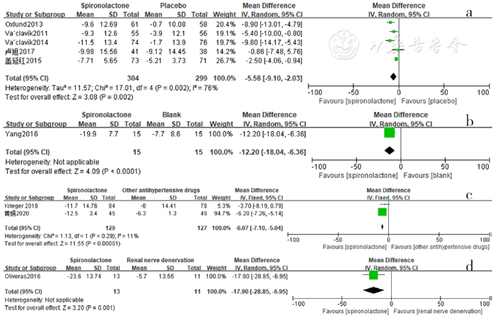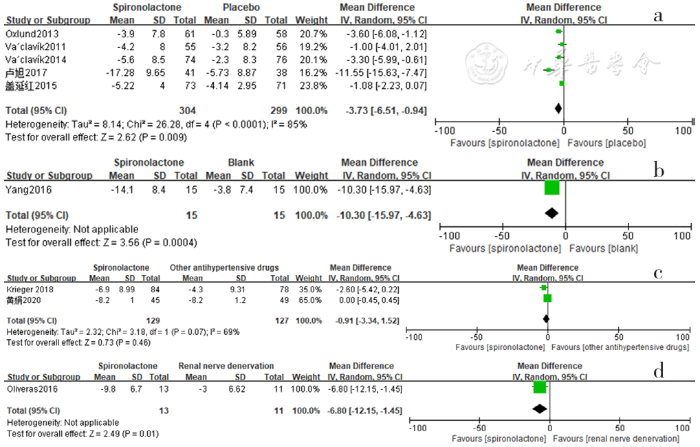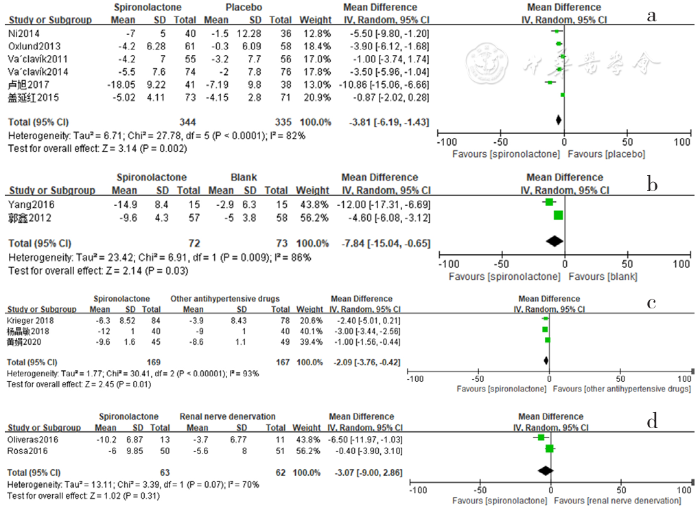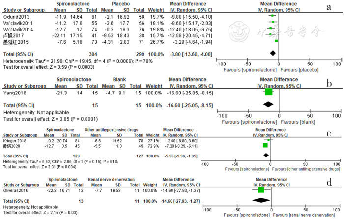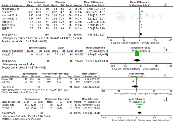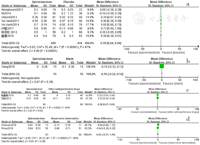 Forest plot of the changes in serum creatinine levels of spironolactone-treated group compared with those of placebo,blank,other antihypertensive drugs and renal sympathetic denervation groups