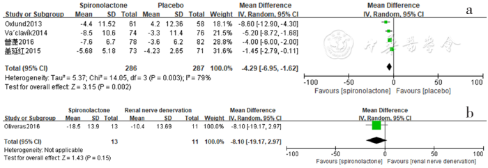 Forest plot of the effect of reducing 24-hour pulse pressure of spironolactone versus placebo,no-treatment(blank) and renal sympathetic denervation