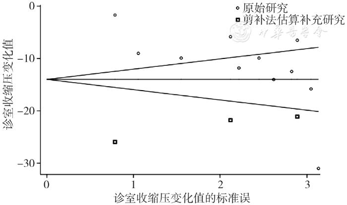 螺内酯组与安慰剂组相比诊室收缩压降低效果指标Egger's(P=0.008)检验显示存在发表偏倚。使用剪补法后,结果变化明显,提示结果不稳健,需谨慎对待,见图20。