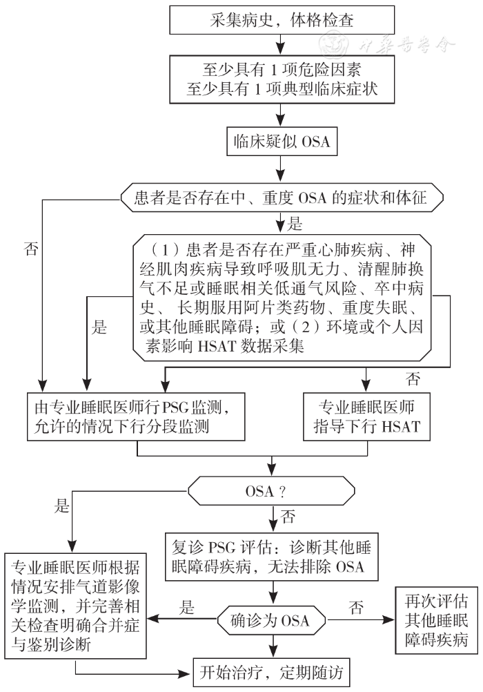 OSA评估主要依据病史采集、体格检查、危险因素、PSG或HSAT结果明确诊断,并评估合并症及鉴别诊断,具体流程见图1。