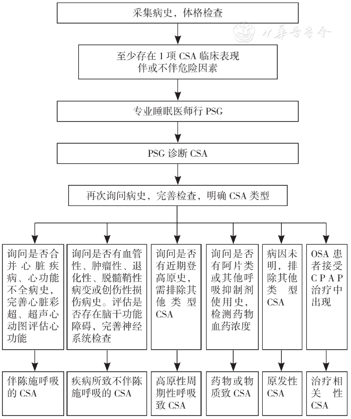 CSA评估主要依据病史采集、体格检查、危险因素、PSG结果,根据病史及相关检查确定CSA类型,指导疾病治疗,具体流程见图2。
