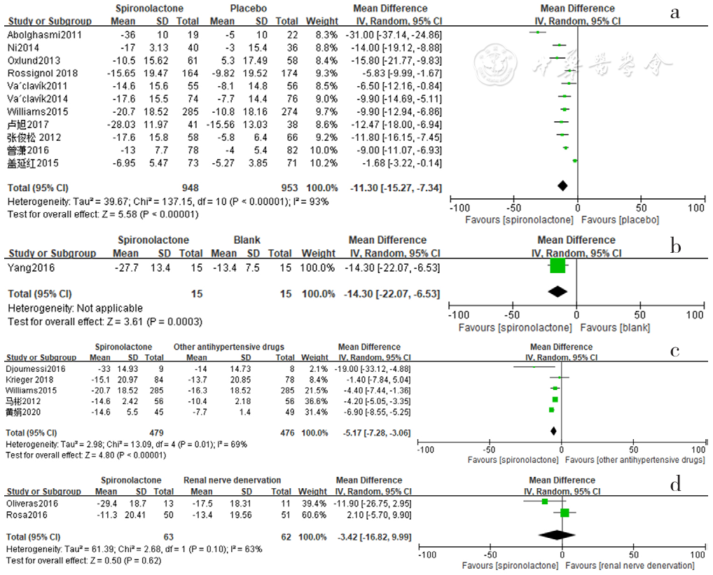 | 图2 螺内酯组与安慰剂组、空白组、其他降压药物组、肾脏去交感神经术组相比诊室收缩压降低效果的森林图 |