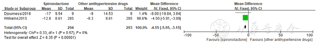 | 图12 螺内酯组与其他降压药物组相比家庭自测收缩压降低效果的森林图 |