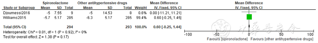 | 图13 螺内酯组与其他降压药物组相比家庭自测舒张压降低效果的森林图 |